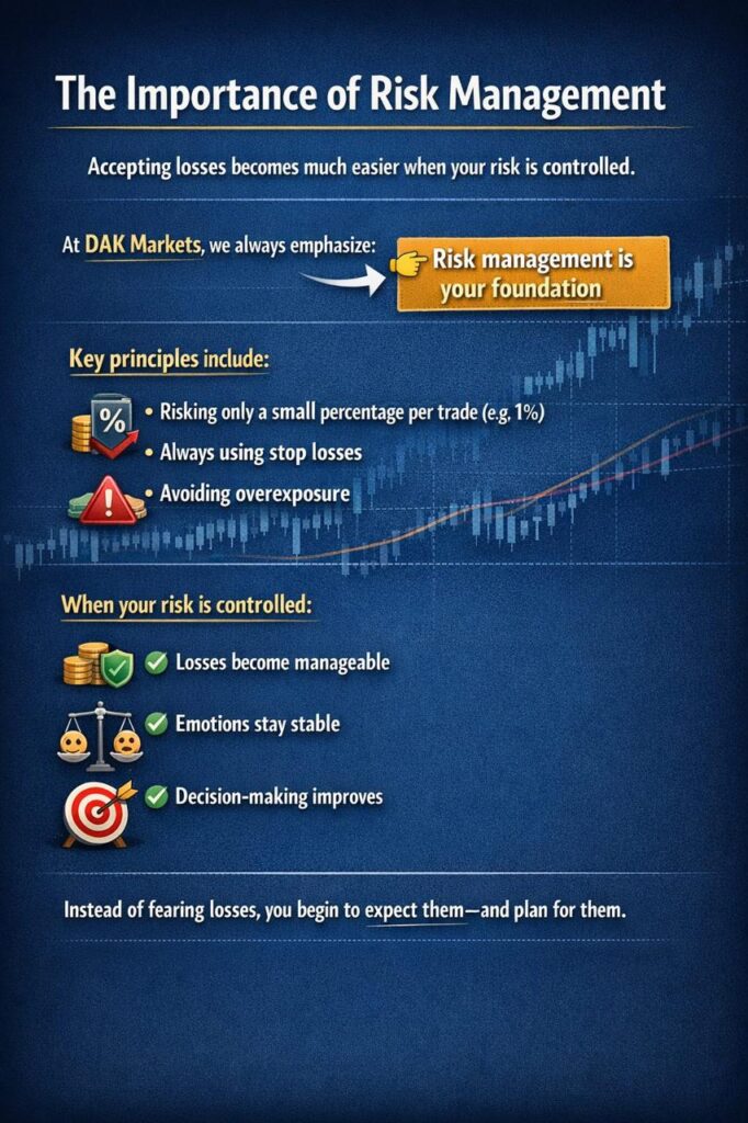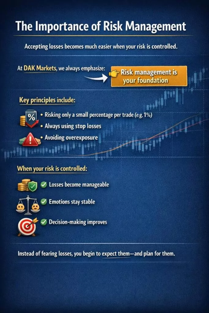 At DAK Markets, we emphasize that trading success is not about avoiding losses. It is about managing them, learning from them, and maintaining discipline through them.