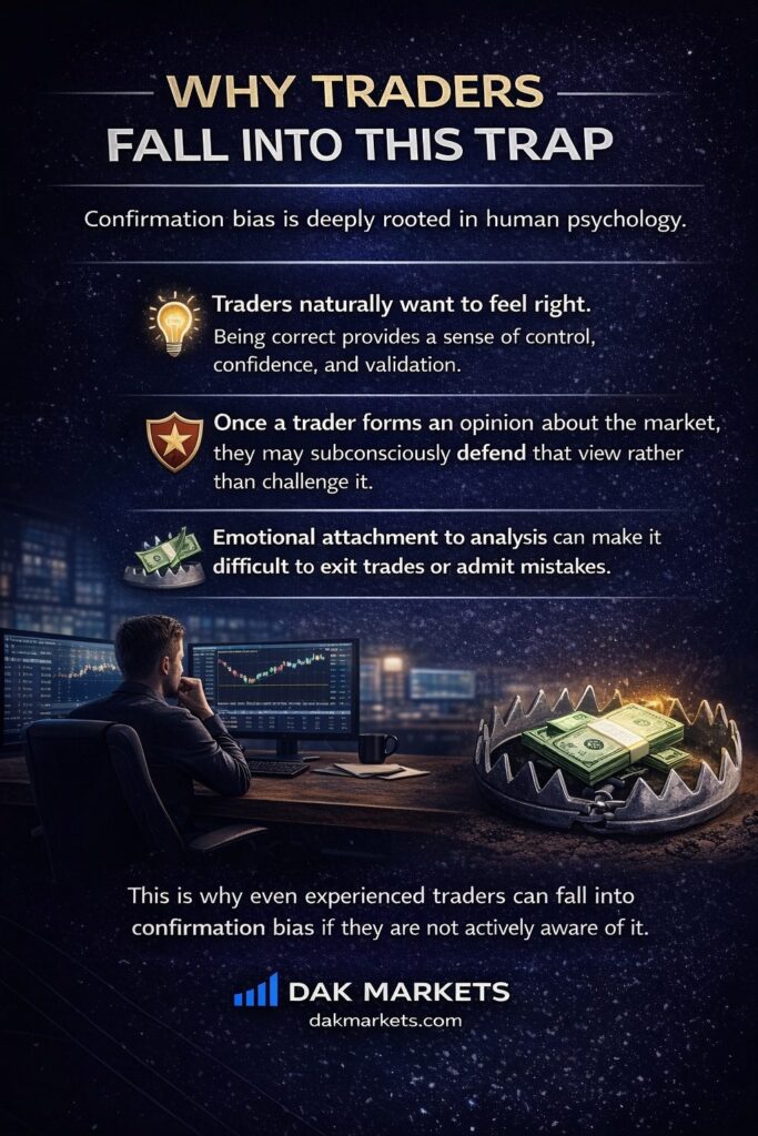Confirmation bias is one of the most common and dangerous psychological traps in trading.