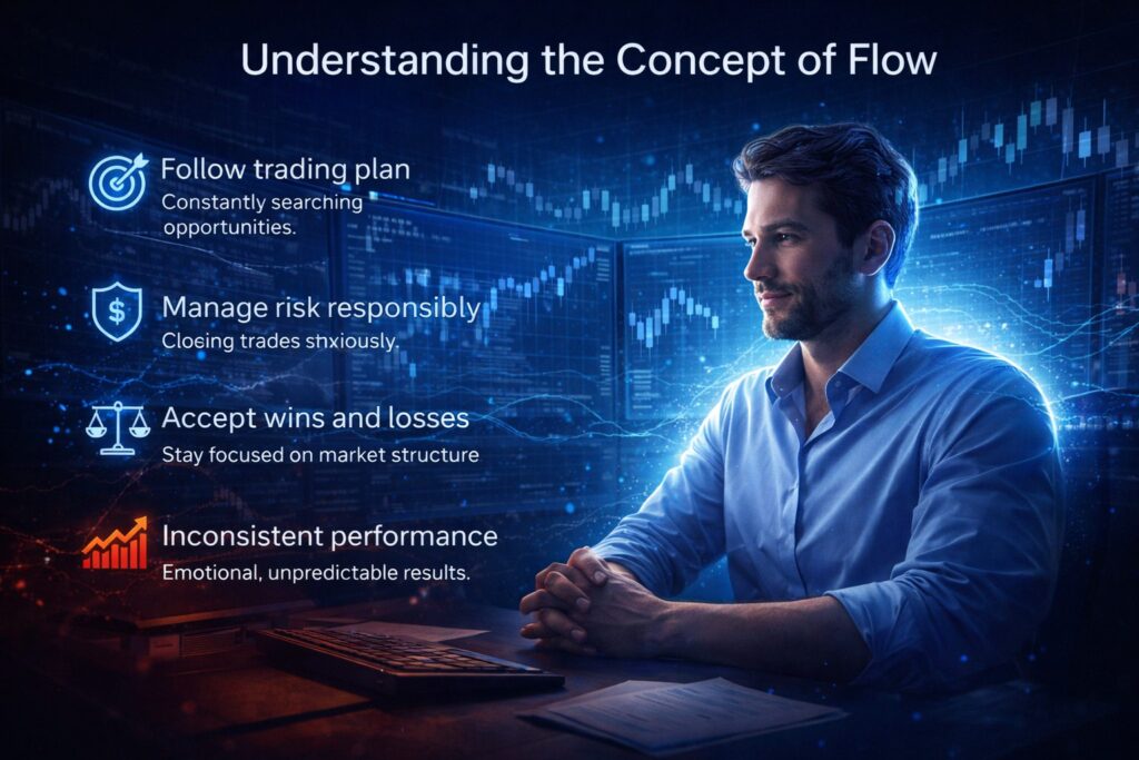 In trading, flow occurs when a trader executes their strategy calmly and without emotional interference.
