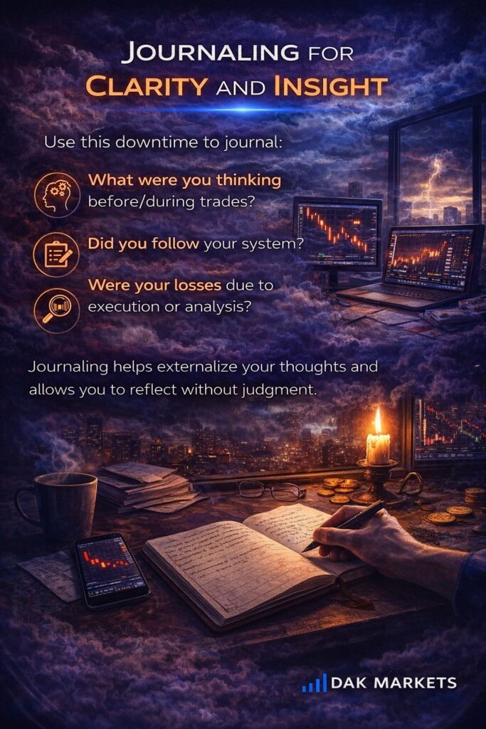 Return to your written trading plan. Revisit your edge, your rules, and your goals. A clear plan reduces emotional interference.
