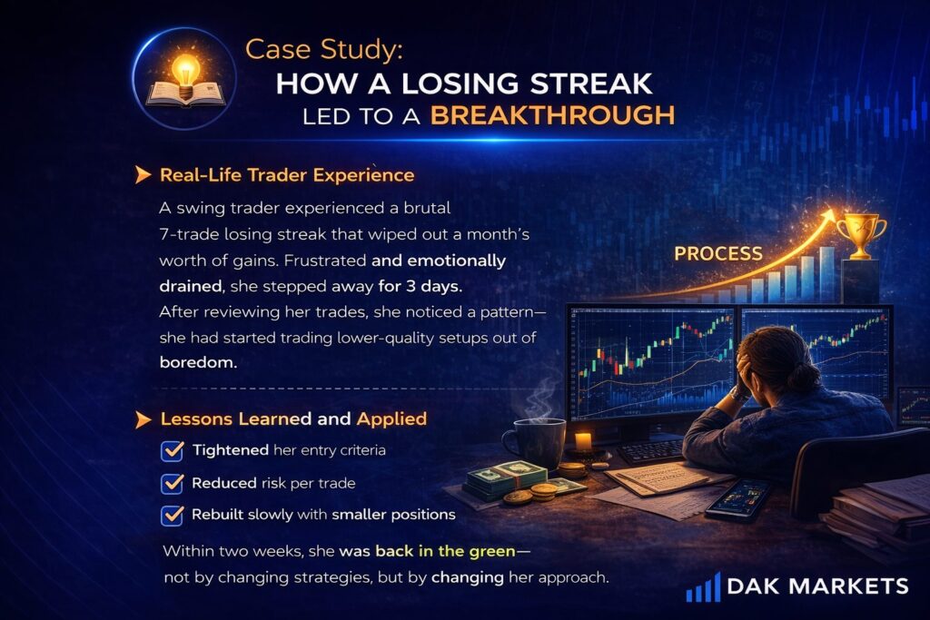 A swing trader experienced a brutal 7-trade losing streak that wiped out a month’s worth of gains. Frustrated and emotionally drained, she stepped away for 3 days. After reviewing her trades, she noticed a pattern—she had started trading lower-quality setups out of boredom.