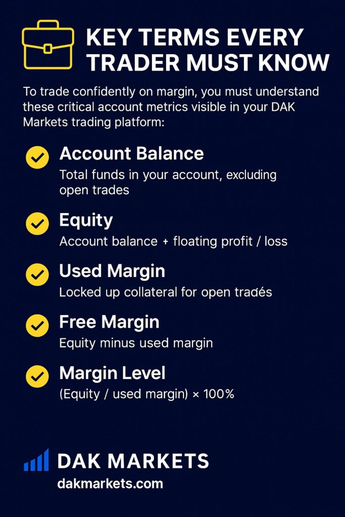 To trade confidently on margin, you must understand these critical account metrics visible in your DAK Markets trading platform: