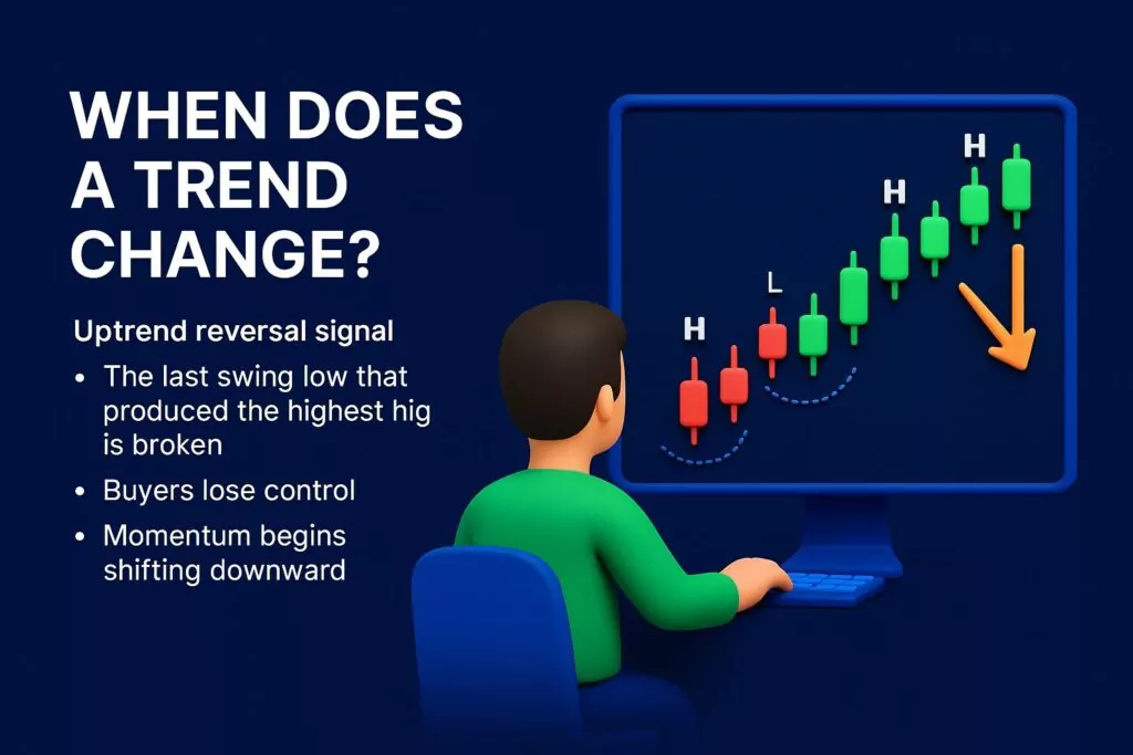In real markets, price often “wicks” past swing points without creating meaningful change. Traders must confirm structure before assuming a reversal.