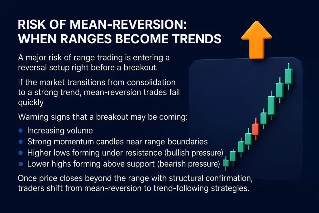 Once price closes beyond the range with structural confirmation, traders shift from mean-reversion to trend-following strategies.
