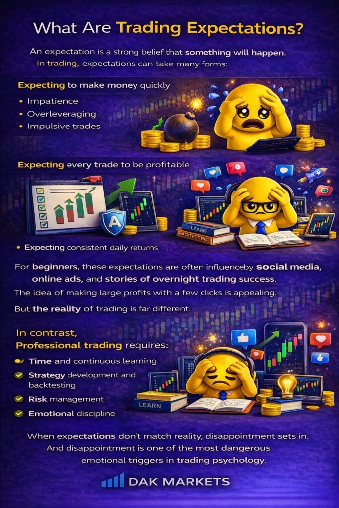 In trading, expectations can be both a powerful motivator and a hidden trap. Every trader enters the markets with certain beliefs about profits, risk, and success. However, unrealistic trading expectations often lead to frustration, impulsive decisions, and inconsistent performance. Understanding how expectations affect trading psychology is essential if you want long-term success in the financial markets.
