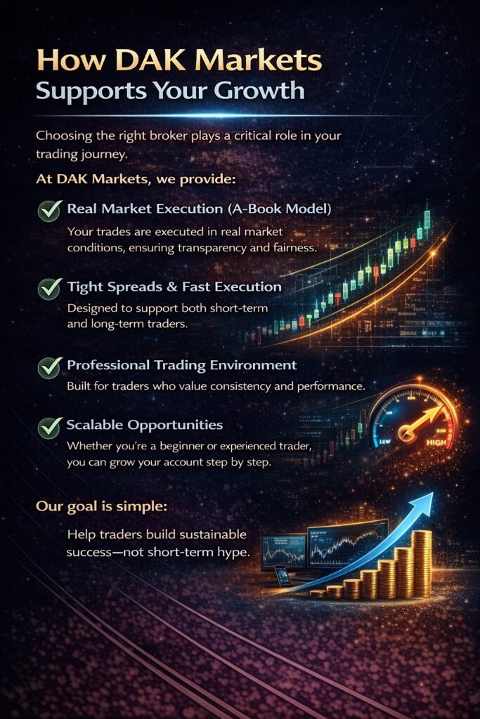 At DAK Markets, traders benefit from institutional-grade execution, helping them manage risk effectively in real market conditions.