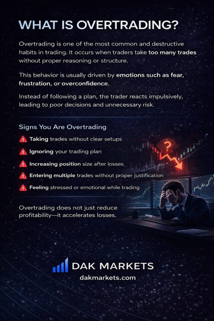 Overtrading is one of the most common and destructive habits in trading. It occurs when traders take too many trades without proper reasoning or structure.